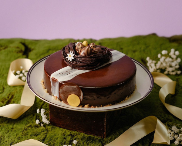 A glossy dark chocolate mirror glaze over layers of chocolate mousse and moist sponge, finished with hazelnut praline cream and crunchy praline. Decorated with a chocolate nest, chocolate eggs, and delicate sugar flowers.