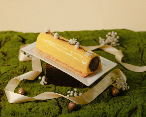 Mango mousse, coconut namelaka and almond dacquoise with mango passion compote on a sable Breton base, finished with a glossy mirror glaze, sugar flowers and miniature chocolate eggs.