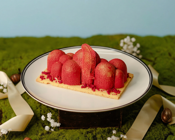 Raspberry cheese mousse with raspberry compote on a buttery sable Breton crust, topped with crunchy raspberry pearls and a velvet chocolate spray finish.